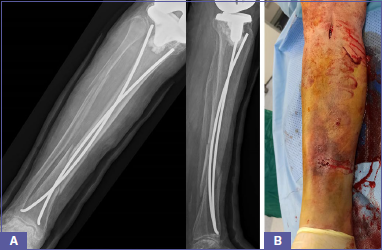 Figure 4.A) 70-year-old female affected by a both-bones leg fracture distal to a total knee arthroplasty treated with elastic nails; B) Skin condition of the patient.