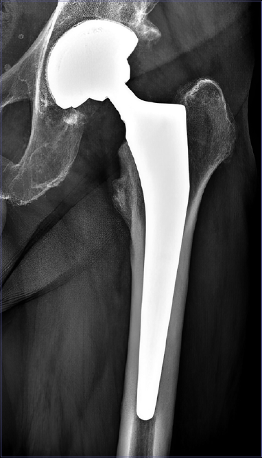 Figure 2.Fifty-eight-year-old man treated with total hip arthroplasty. Radiological divergence of the shell is visible at one-year follow-up. The patient showed no pain in weight-bearing or hip motion.