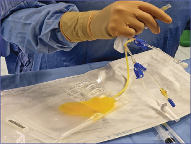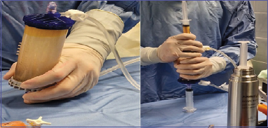 The lipoaspirate is processed using the Lipogems® system (Lipogems International S.p.A), obtaining the microfragmentation of the adipose tissue collected (Fig. 4); approximately 7 mL of the final product is injected in the joint with a common syringe and a 18 Gauge needle (Fig. 5).