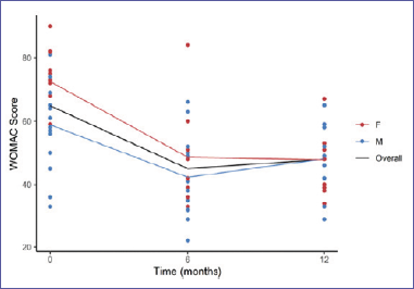 WOMAC score was characterised by a significant reduction between baseline and month 6 (mean difference (MD): -19.8, p value < 0.001). This reduction was consistent in both males and females, and, even if female patients exhibited a more remarked decrease, the difference between sex was not statistically significant (MD: 7.62, p value = 0.178). There was no evidence of differences between WOMAC at time 6 months and WOMAC at time 12 months in the overall sample (MD: 3.23, p value = 0.286) or in each sex separately (Tab. II).
