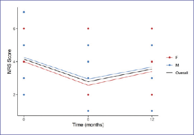 NRS score significantly declined between baseline and month 6 (MD: -1.33, p value = 0.001). This reduction was consistent in both men and women and no differences emerged. NRS slightly increased between month 6 and month 12 (MD: 0.82), but this difference was not significant (Tab. III).