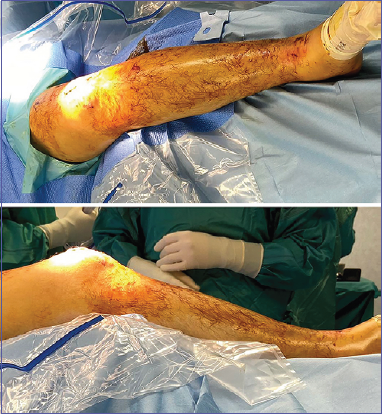 The semi-extended position also facilitates the entry point of the nail. In 2010 Eastman et al. conducted a cadaver study to determine the correlation between the entry point of the nail and the degrees of knee flexion, achieving a significant result especially at 30°-50° flexion, when there is greater alignment in the sagittal plane between the nail and the medullary tibia 15. This, in turn, prevents mechanical conflict with the posterior cortex and the patella-locking effect seen in the IP approach. Therefore, the SP approach has shown significantly better surgical reductions and more precise nail entry point than the IP approach 4,17. With the SP approach, it is easier to perform intraoperative biplanar fluoroscopy, which implies a reduction in both time and fluoroscopy dose 4,10,18. In the literature, several studies have compared the SP versus IP approaches for tibial IMN, showing that the former can shorten intraoperative fluoroscopy time, correct coronal plane angulation and translation deformity, reduce the incidence of anterior knee pain and blood loss, and improve postoperative function 11,18. Controversial disadvantages of the SP approach include femoropatellar (FP) cartilage injury, risk of septic knee arthritis and difficulty of implant removal 19. Regarding FP damage, Gelbke et al. concluded that there is no risk to the cartilage surface during SP nailing 20. In addition, the use of specific trocar systems with protectors that attach to the patellofemoral surface further decrease the possibility of FP injury 20. Cadaveric, preoperative and postoperative arthroscopy studies have been performed to assess FP cartilage damage, and patients undergoing the SP approach have been assessed radiologically and by MRI, but in most cases the findings have not been clinically correlated or have shown minimal advantage 14,18. No significant differences in FP joint damage between the two approaches have been found in most comparative studies 18. There are no long-term studies or sufficient evidence available in the literature to advise against the SP approach. The SP approach has been associated with an increased risk of septic arthritis of the knee in open fractures, but in closed fractures there does not appear to be a significantly increased risk of septic knee arthritis 21. Regarding removal of the implant, the opinion of some authors is that it is no more complicated than in the IP approach while other authors resort to making another incision, at the IP level, to remove the nail 22. However, Branca Vergano et al. have recently published a case series of patients previously treated with SP intramedullary tibial nail and subsequently underwent hardware removal through the same SP approach 23. The reported technique of nail removal was shown to be quick, safe, reproducible, and easy.