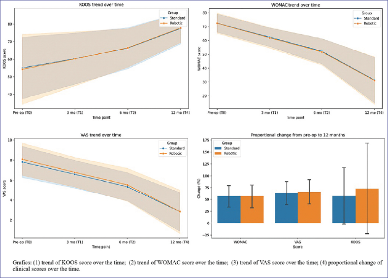 The clinical trend demonstrated progressive improvement in all scores across both groups from baseline to 12 months, with no significant differences in the rate of improvement. These findings suggest that both conventional and robotic-assisted TKA techniques provide substantial clinical benefits for patients with advanced knee osteoarthritis, with comparable outcomes at one year postoperatively. Regarding surgical times, the standard TKA procedure was performed in an average of 55 minutes, unlike the robotic TKA which required an average of 80 minutes.